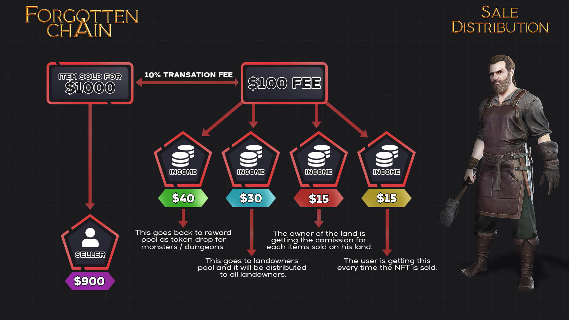 Whenever an NFT is dropped on your land that item will remain bound to the place where it was found. Whenever that particular item is sold a transaction fee of 10% is deducted and it will be distributed as follows:
